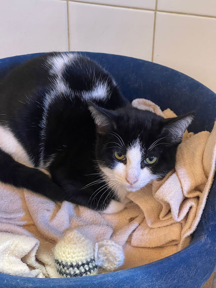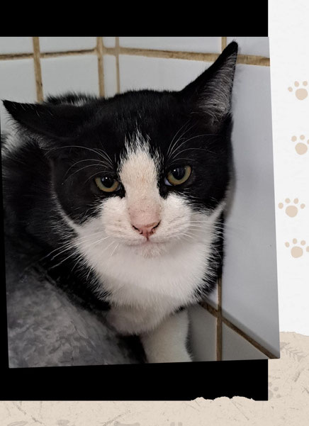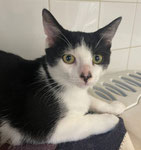 Minou a été trouvé dans la nature et amené au refuge pour sa sécurité. C’est un très beau chat noir et blanc, encore un peu stressé par ce nouvel environnement auquel il doit s’adapter, ce qui explique son côté légèrement peureux.